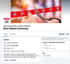 Facebook Events are the perfect way to get users’ attention and drive foot traffic for any local event, including Grand Openings, Customer Appreciation nights, charity events, and more. Our Social team will build out your event post with detailed descriptions, schedules, and creative to help make your event as shareable as possible.
