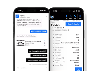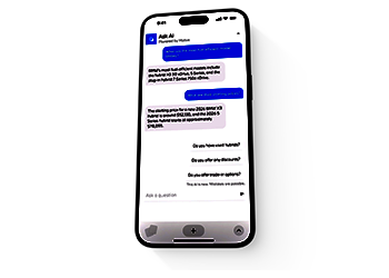 Motive Intelligence gives you AI-powered chat, descriptions, search, and background replacement overnight. Preloaded with BMW data and infinitely expandable with your own custom knowledge base, Ask AI unlocks accurate answers to the hardest questions. And when your customer is ready to start browsing, they can ask for vehicle recommendations directly from Ask AI.